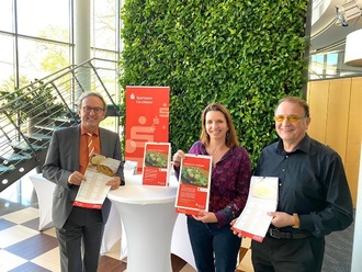 (V.li) Dr. Ewald Maier, Vorstandsvorsitzender der Sparkasse Forchheim, Corinna Brauer, Vorstandsvorsitzende von Gscheitgut und Georg Hötzelein, Vereinsmitglied und Inhaber vom Berg-Gasthof Hötzelein in Regensberg, Kunreuth.