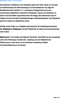 Die Eisenbahn-Ausstellung in der Kaiserpfalz gehört seit vielen Jahren zur Advents- und Weihnachtszeit wie Weihnachtsengel und Adventskalender: Die Züge der Modellbaufreunde Forchheim e. V. schnauben im Erdgeschoss durch eine wunderschöne detailreiche Landschaft mit Gebäuden, Figuren und Szenerien: Zu sehen ist die fünf Meter lange Fleischmann H0-Anlage, eine Fleischmann Spur N-Anlage und eine zehn Meter Gartenbahnanlage mit Bahnbetriebswerk. Drei Spieltische stehen für Kinder zum Selberfahren bereit. Wichtig: Kinder dürfen nur in Begleitung Erwachsener die Ausstellungen besuchen. Der Spielplatz im Pfalzgraben mit dem Pfalzifanten ist während des Adventsmarktes nicht nutzbar.