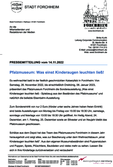 Stadt Forchheim. Es weihnachtet wieder in der festlich geschmückten Kaiserpfalz in Forchheim. Noch bis einschließlich Dreikönig, 06. Januar 2023, präsentiert das Pfalzmuseum Forchheim die Sonderausstellung „Was einst Kinderaugen leuchten ließ – Spielzeug aus den Beständen des Pfalzmuseums“ und natürlich die beliebte Eisenbahn-Ausstellung. Zum Sondereintritt von nur 2 Euro (Kinder unter sechs Jahren haben freien Eintritt) sind beide Ausstellungen von Montag bis Freitag von 15 bis 18:30 Uhr, samstags, sonntags und feiertags von 13 bis 18:30 Uhr geöffnet. An Heilig Abend, 24. Dezember, am 1. Feiertag, 25. Dezember sowie an Silvester und an Neujahr bleibt das Pfalzmuseum geschlossen. Schätze aus dem Depot hat das Team des Pfalzmuseums Forchheim in diesem Jahr herausgeholt und zeigt alles, was zur Bescherung unter dem Weihnachtsbaum „einst Kinderaugen leuchten ließ“. Aus den eigenen Museumsbeständen sind Puppenstuben und Puppen, Spiele, Plüschtiere, Baukästen und vieles mehr zu sehen. Lassen Sie sich in Ihre Kindertage zurückversetzen und verzaubern!