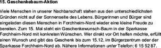 Forchheim (bz-mgh). Viele Menschen in unserer Nachbarschaft stehen aus den unterschiedlichsten Gründen nicht auf der Sonnenseite des Lebens. Bürgerinnen und Bürger sind eingeladen, diesen Menschen in Forchheim-Nord wieder eine kleine Freude zu bereiten. Zum 15. Mal steht ein Geschenkewunsch-Baum in der Sparkasse Forchheim-Nord mit konkreten Wünschen. Wer direkt vor Ort helfen möchte, erfüllt einen Wunsch und gibt das Geschenk bis zum 15.12. im Bürgerzentrum oder der Sparkasse Forchheim-Nord ab. Nähere Informationen unter Telefon: 6 15 52 87.