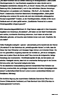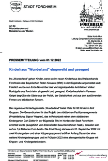 (Stadt Forchheim). Ins „Wunderland“ gehen Kinder, wenn sie im neuen Kinderhaus des Kreisverbands Forchheim des Bayerischen Roten Kreuzes (BRK) in der Bügstraße angemeldet sind. Feierlich wurde nun Ende November das Vorzeigeobjekt des Architekten Volker Rosbigalle aus Forchheim eingeweiht und gesegnet. Kinderhausleiterin Vanessa Geipel begrüßte die Gäste aus der Politik, der Geistlichkeit und aus den ausführenden Firmen und städtischen Ämtern. Die nagelneue Kindertagesstätte bietet Platz für 92 Kinder in fünf Gruppen. Die Gesamtkosten für das Projekt des städtischen Facilitymanagements (Projektleitung: Sigrun Wagner), das in Rekordzeit neben dem städtischen Kindergarten Carl-Zeitler in der Bügstraße 79c im Norden der Stadt Forchheim errichtet wurde (ausgeführt vom Ebensfelder Bauunternehmen Raab), belaufen sich auf ca. 5,4 Millionen Euro brutto. Die Einrichtung startete am 01. September 2022 mit zwei Kindergarten- und einer Krippengruppe und eröffnet Anfang Dezember eine weitere Kindergartengruppe und im Frühjahr 2023 eine altersgemischte Gruppe mit Krippen- und Kindergartenkindern. „Die Stadt Forchheim hat nun wirklich Erfahrung im Kindergartenbau!“, schmunzelte Oberbürgermeister Dr. Uwe Kirschstein angesichts der vielen kürzlich erst im Stadtgebiet verwirklichten (Neubau KiTa „Im Grund“, Neubau KiTa „Am Schießanger“, Sanierung KiGa „Sudetenstraße“), noch im Bau befindlichen (Neubau Merowinger Kindergarten) und geplanten („Am Seetalweg - Kita Burk“, „Am Sportplatz -Kita Reuth“, Ersatzneubau Kinderhort Marienheim) Kindertagesstätten: „Keine gleicht allerdings einer anderen! Sie wurden alle nach dem individuellen pädagogischen Konzept ausgerichtet!“ Trotzdem, so der Oberbürgermeister, müssten all die neuen Gebäude noch mit Leben gefüllt werden: „Qualifiziertes Personal ist in unseren Kindertagesstätten dringend gesucht!“ BRK-Keisverbandsgeschäftsführerin Dr. Birgit Kastura zeigte sich in ihrer Ansprache begeistert vom Kinderhaus „Wunderland“: „Wir haben von der Stadt Forchheim eine sehr schöne, durchdachte Einrichtung bekommen. Auch haben wir schon tolle Mitarbeiter gefunden, wir brauchen aber trotzdem immer noch mehr. Empfehlen Sie uns weiter!“ Volker Rosbigalle (rosbigalle + glauber - planwerkstatt gmbh) bezeichnete den Namen „Wunderland“ für das Kinderhaus als „verheißungsvollen Namen“, er hoffe, dass die Kinder hier ihren Wünschen und Interessen folgen können und Antworten finden. Die von ihm geschaffene Umgebung beschrieb der Architekt so: „Mir ist am wichtigsten, dass man in jedem Raum die Sonne sieht!“ Dazu komme die kindgerechte, farbige Gestaltung des Innenbereichs - Wohlfühlatmosphäre für alle, die hier spielen und arbeiten. Rosbigalle betonte, dass trotz der erschwerten Bedingungen in der Corona-Zeit eine echte, tolle Teamarbeit stattgefunden habe. Für die detailreiche Innenausstattung zeichnet Innenarchitekt Peter Schieder aus Nürnberg verantwortlich, den großzügige Außenbereich mit vielen Spielgelegenheiten entwarf Landschaftsarchitekt Bernard Lorenz (Lorenz Landschaftsarchitekten und Stadtplaner, Nürnberg). Die kirchliche Segnung des neuerrichteten Gebäudes übernahmen Pfarrer Knut Cramer (Christuskirche Forchheim) und Pater Bernhard Kuhn SDB (Pfarrvikar im Seelsorgebereich Forchheim).