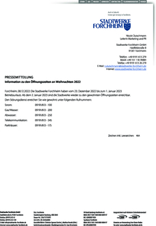 (Stadtwerke Forchheim). Die Stadtwerke Forchheim haben vom 23. Dezember 2022 bis zum 1. Januar 2023 Betriebsurlaub. Ab dem 2. Januar 2023 sind die Stadtwerke wieder zu den gewohnten Öffnungszeiten erreichbar. Den Störungsdienst erreichen Sie wie gewohnt unter folgenden Rufnummern: