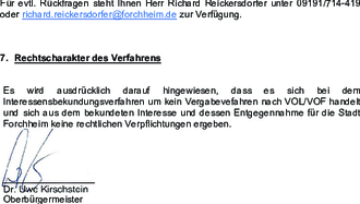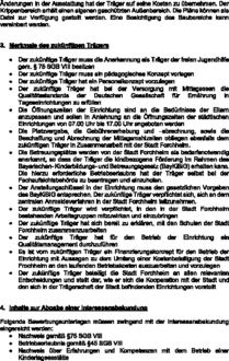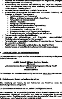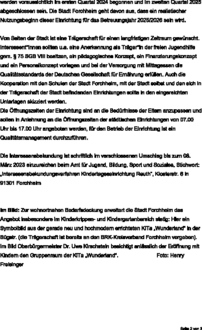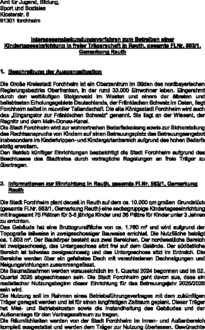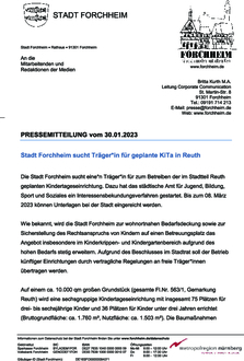 (Stadt Forchheim). Wie bekannt, wird die Stadt Forchheim zur wohnortnahen Bedarfsdeckung sowie zur Sicherstellung des Rechtsanspruchs von Kindern auf einen Betreuungsplatz, das Angebot insbesondere im Kinderkrippen- und Kindergartenbereich aufgrund des hohen Bedarfs stetig erweitern. Aufgrund des Beschlusses im Stadtrat soll der Betrieb künftiger Einrichtungen durch vertragliche Regelungen an freie Träger*innen übertragen werden. Auf einem ca. 10.000 qm großen Grundstück (gesamte Fl.Nr. 563/1, Gemarkung Reuth) wird eine sechsgruppige Kindertageseinrichtung mit insgesamt 75 Plätzen für drei- bis sechsjährige Kinder und 36 Plätzen für Kinder unter drei Jahren errichtet (Bruttogrundfläche: ca. 1.760 m², Nutzfläche: ca. 1.503 m²). Die Baumaßnahmen werden voraussichtlich im ersten Quartal 2024 begonnen und im zweiten Quartal 2025 abgeschlossen sein. Die Stadt Forchheim geht davon aus, dass ein realistischer Nutzungsbeginn dieser Einrichtung für das Betreuungsjahr 2025/2026 sein wird. Vonseiten der Stadt ist eine Trägerschaft für einen langfristigen Zeitraum gewünscht. Interessent*innen sollten u.a. eine Anerkennung als Träger*in der freien Jugendhilfe gem. § 75 SGB VIII besitzen, ein pädagogisches Konzept, ein Finanzierungskonzept und ein Personalkonzept vorlegen und bei der Versorgung mit Mittagessen die Qualitätsstandards der Deutschen Gesellschaft für Ernährung erfüllen. Auch die Kooperation mit den Schulen der Stadt Forchheim, mit der Stadt selbst und den sich in der Trägerschaft der Stadt befindenden Einrichtungen sollte in den eingereichten Unterlagen skizziert werden. Die Öffnungszeiten der Einrichtung sind an die Bedürfnisse der Eltern anzupassen und sollen in Anlehnung an die Öffnungszeiten der städtischen Einrichtungen von 7.00 Uhr bis 17.00 Uhr angeboten werden, für den Betrieb der Einrichtung ist ein Qualitätsmanagement durchzuführen. Die Interessensbekundung ist schriftlich im verschlossenen Umschlag bis zum 8. März 2023 einzureichen beim Amt für Jugend, Bildung, Sport und Soziales, Stichwort: „Interessensbekundungsverfahren Kindertageseinrichtung Reuth“, Klosterstr. 6 in 91301 Forchheim.