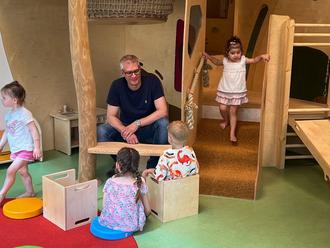 Henri Freisinger, Ingenieurbüro Freisinger GmbH & Co.KG - Oberbürgermeister Dr. Uwe Kirschstein besichtigt anlässlich der Eröffnung mit Kindern den Gruppenraum der KiTa „Wunderland“ deren Trägerschaft der BRK-Kreisverband Forchheim übernommen hat.
