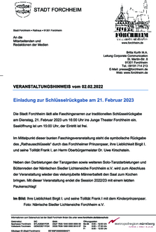 (Stadt Forchheim). Die Stadt Forchheim lädt alle Faschingsnarren zur traditionellen Schlüsselrückgabe am Dienstag, 21. Februar 2023 um 16.00 Uhr ins Junge Theater Forchheim ein. Saalöffnung ist um 15.00 Uhr, der Eintritt ist frei. Im Mittelpunkt dieser bunten Faschingsveranstaltung steht die symbolische Rückgabe des „Rathausschlüssels“ durch das Forchheimer Prinzenpaar, ihre Lieblichkeit Birgit I. und seine Tollität Frank I, an Herrn Oberbürgermeister Dr. Uwe Kirschstein. Neben den Darbietungen der Tanzgarden sowie weiteren Solo-Tanzdarbietungen und Büttenreden der Närrischen Siedler Lichteneiche Forchheim e.V. wird zum Abschluss der Veranstaltung wieder das viel umjubelte Männerballett den Saal zum Kochen bringen. Mit dieser Veranstaltung endet die Session 2022/23 mit einem letzten Paukenschlag!