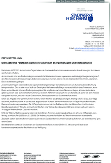 (Stadtwerke Forchheim). In letzter Zeit haben die Stadtwerke Forchheim wieder vermehrt Anrufe besorgter Kundinnen und Kunden erhalten. An der Haustür oder am Telefon drängen vermeintliche Mitarbeitende oder sogenannte unabhängige Energiemanager auf den Abschluss eines Energievertrages. Dabei wird vorgetäuscht, man arbeite mit den Stadtwerken Forchheim zusammen. Das ist schlichtweg gelogen. „In den letzten Tagen haben selbst uns sogenannte Energiemanager kontaktiert, die von uns Kundendaten in Erfahrung bringen wollten. Dies ist eine neue Stufe der Dreistigkeit. Wir können alle Bürger nur ausdrücklich darauf hinweisen, keine Daten an der Haustür oder am Telefon preiszugeben. Wir empfehlen nach dem Namen zu fragen, sich eine Visitenkarte geben zu lassen oder sich die Telefonnummer zu notieren. Nehmen Sie danach mit uns Kontakt auf, damit wir dem Hinweis nachgehen können“, erläutert Nicole Dutschmann, Pressesprecherin der Stadtwerke Forchheim. Schon die Angabe einer Zählernummer reicht für einen Wechsel des Energieversorgers. Wichtig: Strom- und Gasverträge, die online, telefonisch oder an der Haustür abgeschlossen wurden, können innerhalb von 14 Tagen widerrufen werden. Dann wird der Vertrag unwirksam. Die 14 Tage beginnen erst mit der Belehrung über das Widerrufsrecht, z.B. mit dem Begrüßungsschreiben. Wer also erst nach drei Wochen eine Vertragsbestätigung erhält, kann immer noch von seinem 14-tägigen Widerrufsrecht Gebrauch machen. Fehlt die Widerrufsbelehrung ganz, haben die betroffenen Personen ab Vertragsabschluss ein Jahr und 14 Tage Zeit, den Vertrag zu widerrufen (§ 356 Abs. 3 S.2 BGB). Die Verbraucherzentralen haben auf ihren Internetseiten Musterbriefe. Zusätzlich sollten die betroffenen Kunden auch mit den Stadtwerken Forchheim Kontakt aufnehmen, die beim Widerruf gern unterstützen. Bei Unklarheiten steht das Serviceteam der Stadtwerke telefonisch unter 09191/613 240 oder per E-Mail unter kundenservice@stadtwerke-forchheim.de zur Verfügung.