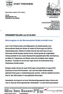 (Stadt Forchheim). Auch in den Wintermonaten wird kräftig gebaut: So entsteht gerade in der Bammersdorfer Straße der Rohbau für weitere 22 Wohnungen der GWS in Holzhybridbauweise. Während im letzten Sommer das erste Haus mit neun Wohnungen bereits bezogen werden konnte, werden gerade die vorgefertigten Holzbauwandteile für den zweiten Bauabschnitt aufgestellt. Die Mischung aus Beton für Treppenhaus und Decken sowie Holz ermöglicht einen zügigen Bauablauf - innerhalb von ein bis zwei Tagen können die Außenwände eines Geschosses errichtet werden. Bezogen werden können die neuen Wohnungen voraussichtlich im August 2023. Zusammen mit der WVG Forchheim - die in der Paul Keller Straße ebenfalls geförderte Wohnungen in Holzhybridbauweise errichtet - erhält der Stadtteil Forchheim Nord im Jahr 2023 weitere 41 neue geförderte Wohnungen! Interessierte, die Anspruch auf einen Wohnberechtigungsschein haben, können sich noch im Haus der Wohnungswirtschaft, Herderstraße 1 um eine Wohnung bewerben.