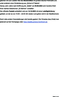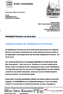 (Stadt Forchheim). Die Stadtbücherei Forchheim hat viel zu feiern! Seit 80 Jahren gibt es eine städtische Bücherei in Forchheim und bereits seit zehn Jahren befindet sich diese im Neubau in der Spitalstraße 3. Das Festjahr steht unter dem Motto „Stadtbücherei Forchheim - Ein Ort für ALLE“. Zum Jubiläumsauftakt heißt es am Samstag, 25. Februar 2023 von 10.00 Uhr bis 14.00 Uhr „Hereinspaziert - Feiern Sie mit uns“. Zusätzlich zur normalen Ausleihe gibt es Snacks, Kuchen und Getränke für alle, Vorlesespaß für Kinder, eine DIY-Bastelstation und einige Überraschungen für Jung und Alt. Die Saatgutbibliothek ist wieder aufgefüllt und bereit für die nächste Gartensaison. Anders als sonst sind lebhafte Gespräche durchaus erwünscht - es darf also laut werden! Einige weitere Veranstaltungshighlights anlässlich des Doppel-Jubiläums sind bereits festgelegt: Am 23. Juni 2023 gibt es eine Open-Air-Lesung zum Thema „Kriminelles Franken“ mit Tommie Goerz im KulturSommerQuartier und einen Tag später am gleichen Ort zum zweiten Mal das Büchereifest mit großem Bücher-Flohmarkt und unter anderem einer Kinderlesung aus „School of Talents“. Genau zehn Jahre nach Eröffnung der „StaBü“ am 5. August 2023 wird Caroline Wahl ihren starken Debütroman „22 Bahnen“ vorstellen. Der offizielle Festakt schließlich wird am 14. Oktober 2023 mit einer LateNightLibrary gefeiert, an der es von 10.00 - 22.00 Uhr wieder rund gehen wird in der Stadtbücherei. Noch viele andere Veranstaltungen sind bereits geplant. Die Hinweise dazu findet man jederzeit auf der Homepage unter www.stadtbuecherei.forchheim.de.