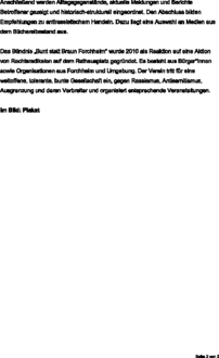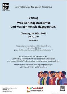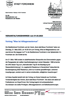 (Stadt Forchheim). Die Stadtbücherei Forchheim und der Verein „Bunt statt Braun Forchheim“ laden am Dienstag, 21. März 2023, um 19.30 Uhr zum Vortrag „Was ist Alltagsrassismus und was können Sie dagegen tun?“ in die Stadtbücherei Forchheim in der Spitalstraße 3 in Forchheim ein. Der Eintritt ist frei. Am 21. März 1960 endete im südafrikanischen Sharpeville eine Demonstration gegen die Passgesetze der weißen Apartheitsregierung in einem Massaker. 1966 ernannte die UNO diesen Tag zum „Internationalen Tag für die Beseitigung der Rassendiskriminierung“. Im „Lagebericht Rassismus in Deutschland“ beleuchtet die Bundesregierung 2022 Rassismus „nicht nur in seinen gewaltförmigen, extremen Ausprägungen, sondern auch in seinen strukturellen, alltäglichen Auswirkungen“. Auf diese Aspekte bezieht sich der Vortrag von Sonja Hodacsik aus Forchheim, Vorstandsmitglied des Vereins „Bunt statt Braun Forchheim“. Sie stützt sich dabei auf Publikationen von Expert*innen: Der Vortrag beginnt mit antirassistischem Grundwissen wie weiße Privilegien, Mikroaggressionen und Selbstbezeichnungen. Anschließend werden Alltagsgegenstände, aktuelle Meldungen und Berichte Betroffener gezeigt und historisch-strukturell eingeordnet. Den Abschluss bilden Empfehlungen zu antirassistischem Handeln. Dazu liegt eine Auswahl an Medien aus dem Büchereibestand aus. Das Bündnis „Bunt statt Braun Forchheim“ wurde 2010 als Reaktion auf eine Aktion von Rechtsradikalen auf dem Rathausplatz gegründet. Es besteht aus Bürger*innen sowie Organisationen aus Forchheim und Umgebung. Der Verein tritt für eine weltoffene, tolerante, bunte Gesellschaft ein, gegen Rassismus, Antisemitismus, Ausgrenzung und deren Verbreiter und organisiert entsprechende Veranstaltungen.