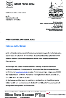 (Stadt Forchheim). „Ja, ich will!“ Forchheim ist um eine stimmungsvolle Hochzeits-Location reicher - denn im Kulturraum St. Gereon kann ab sofort standesamtlich geheiratet werden. Das erste Brautpaar gab sich am 4. März in der spätgotischen Kapelle das Eheversprechen. Die Trauungen in St. Gereon finden ausschließlich samstags an den vom Standesamt Forchheim festgesetzten Terminen statt. Die Termine sind über die Homepage der Stadt Forchheim unter www.forchheim.de abrufbar. Terminreservierungen erfolgen ausschließlich über das Standesamt Forchheim. Die weiteren Trauungstermine in diesem Jahr sind: 22.April, 27. Mai, 24.Juni, 22. Juli, 16. September und 14. Oktober 2023. Für die Nutzung des Kulturraums ist, zusätzlich zu den Gebühren der Eheschließung, eine Gebühr von 100 Euro zu entrichten sowie die Gebühr von 70 Euro für Trauungen außerhalb der regulären Öffnungszeiten des Standesamtes. Standesamtliche Trauungen sind übrigens auch im Kaisersaal der Kaiserpfalz möglich oder, ganz regulär, im Trauungszimmer im Standesamt Forchheim. Trauungen werden hier werktags jeweils Montag- bis Freitagvormittag in der Zeit von 9.00 bis 11.30 Uhr durchgeführt. Weitere Informationen sind unter www.forchheim.de unter dem Menü-Punkt „Heiraten in Forchheim“ detailliert beschrieben.