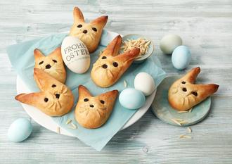 Den gegangenen Hefeteig leicht mit Mehl bestreuen und auf leicht bemehlter Arbeitsfläche zu einer Rolle formen. In etwa 12 gleich große Stücke teilen und jedes Stück zu einer Kugel formen. Aus jeder Kugel einen etwa 12 cm langen Tropfen formen und etwas flach drücken. Das spitze Ende bis knapp zur Hälfte einschneiden und zu Ohren formen. Die Teigstücke auf das Backblech legen und mit Milch bestreichen. Die Rosinen als Augen und Schnauze eindrücken. Mandelstifte als Barthaare anlegen. Die Hasengesichter noch etwa 15 Min. gehen lassen. Das Blech in den Backofen schieben.