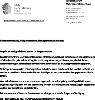 Forchheim (BZ-MGH). Das Bürgerzentrum-Mehrgenerationenhaus fördert den Austausch zwischen den Generationen. Es möchte Familien, die sich im Alltag Unterstützung wünschen, mit Menschen, die Zeit haben, zusammenbringen. Einzelpersonen oder Paare können sich als Wunschgroßeltern engagieren. Sie bringen einen großen Erfahrungsschatz mit, stehen den Familien mit Rat und Tat zur Seite und werden schnell beim Spielen oder kleinen Ausflügen zu vertrauensvollen Bezugspersonen für die Kinder. Wer sich als Wunschoma oder - opa einbringen möchte, sollte geistig und körperlich fit sowie begeisterungsfähig sein. Vor der Vermittlung werden in Gesprächen die Vorstellungen besprochen und bei der Vermittlung berücksichtigt. Bei Interesse steht Verena v. Sass-Kratzer vom Bürgerzentrum für Fragen zur Verfügung. Tel.: 0176/45555199 oder wunschgrosseltern@forchheim-nord.de.