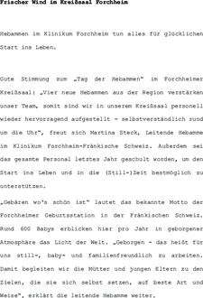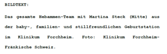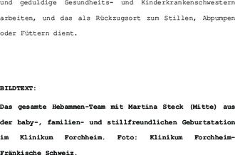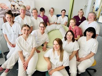 (Klinikum Forchheim-Fränkische Schweiz). Gute Stimmung zum „Tag der Hebammen“ im Forchheimer Kreißsaal: „Vier neue Hebammen aus der Region verstärken unser Team, somit sind wir in unserem Kreißsaal personell wieder hervorragend aufgestellt - selbstverständlich rund um die Uhr“, freut sich Martina Steck, Leitende Hebamme im Klinikum Forchheim-Fränkische Schweiz. Außerdem sei das gesamte Personal letztes Jahr geschult worden, um den Start ins Leben und in die (Still-)Zeit bestmöglich zu unterstützen. „Gebären wo's schön ist“ lautet das bekannte Motto der Forchheimer Geburtsstation in der Fränkischen Schweiz. Rund 600 Babys erblicken hier pro Jahr in geborgener Atmosphäre das Licht der Welt. „Geborgen - das heißt für uns still-, baby- und familienfreundlich zu arbeiten. Damit begleiten wir die Mütter und jungen Eltern zu den Zielen, die sie sich selbst setzen, auf beste Art und Weise“, erklärt die leitende Hebamme weiter. Dr. Stefan Weingärtler, Chefarzt für Geburtshilfe und Gynäkologie am Klinikum Forchheim, lobt die Arbeit der Hebammen. „Unsere zahlreichen Hebammen tragen entscheidend zum Erfolg unserer Entbindungsstation mit der familiären Atmosphäre bei. Die werdenden Mütter können sich bei uns dank der persönlichen Zuwendung wirklich wohl fühlen“, freut sich Dr. Weingärtler. „Ob Geburts- oder Stillwünsche - wir gehen jeden Weg mit, ganz individuell und persönlich!", sagt Martina Steck. „Frau“ habe die Wahl zwischen drei modernen Kreißsälen, erklärt Steck und verweist auf das breite Angebot für junge Eltern im Klinikum Forchheim. Die medizinische Versorgung reiche von alternativen Methoden wie Akupunktur, Homöopathie und Co. bis hin zur klassischen Schulmedizin inklusive Lachgas und PDA. „Nach der Geburt legen wir viel Wert auf ausgiebigen Hautkontakt und das erste Anlegen, um eine harmonische und unkomplizierte Stillzeit einzuläuten. Unsere Stillrate mit etwa 80 Prozent vollgestillten Kindern ist für uns die beste Rückmeldung“, freut sich Steck und betont, dass „selbstverständlich kein Stillzwang" existiert. Ein weiterer wichtiger Vorteil sei das beliebte Kinderzimmer, in dem rund um die Uhr erfahrene und geduldige Gesundheits- und Kinderkrankenschwestern arbeiten, und das als Rückzugsort zum Stillen, Abpumpen oder Füttern dient. Das gesamte Hebammen-Team mit Martina Steck (Mi.) aus der baby-, familien- und stillfreundlichen Geburtstation im Klinikum Forchheim.
