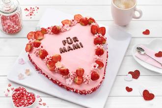 Erdbeeren waschen, putzen, aber das Grün dran lassen und Früchte halbieren. Dekor mit Hilfe einer Teigkarte am Rand der Torte verteilen. Torte mit Erdbeeren und Dekorblüten verzieren. Dekor nach Belieben aufstreuen und das Muttertagsherz servieren.