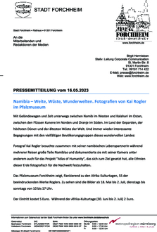 (Stadt Forchheim). Mit Geländewagen und Zelt unterwegs zwischen Namib im Westen und Kalahari im Osten, zwischen den Flüssen Kunene im Norden und Oranje im Süden. Im Land der Geparden, der höchsten Dünen und der ältesten Wüste der Welt. Und immer wieder interessante Begegnungen mit den vielfältigen Bevölkerungsgruppen dieses wundervollen Landes: Fotograf Kai Rogler besuchte zusammen mit seiner namibischen Lebenspartnerin während mehrerer Reisen große Teile Namibias und dokumentierte sie mit seiner Kamera unter anderem auch für das Projekt "Atlas of Humanity", das sich zum Ziel gesetzt hat, alle Ethnien dieser Erde fotografisch für die Nachwelt festzuhalten. Das Pfalzmuseum Forchheim zeigt, flankierend zu den Afrika-Kulturtagen, 55 der beeindruckenden Werke Roglers. Zu sehen sind die Bilder noch bis 2. Juli 2023, dienstags bis sonntags von 10.00 bis 17.00 Uhr. Der Eintritt kostet 5 Euro. Während der Afrika-Kulturtage (30. Juni bis 2. Juli 2023) 2 Euro.
