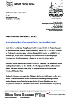 (Stadt Forchheim). In ein kleines Lexikon der „Nutzpflanzenvielfalt“ verwandelt sich die Treppenhausgalerie der Stadtbücherei mit einer neuen Ausstellung, die bis zum 18. Juli 2023 zu sehen ist. Als Begleitveranstaltung zur beliebten Saatgutbibliothek, die es seit 2022 in der Bücherei gibt, wurde diese Ausstellung in Zusammenarbeit mit der Ortsgruppe Forchheim des BUND Naturschutz in Bayern e. V. nach Forchheim geholt. Konzipiert wurden die Informationstafeln von BUND Hannover. Die Ausstellung enthält unzählige Informationen zu den Gründen des Rückgangs der Sortenvielfalt auf den Äckern, aber auch wunderschöne Bilder zu verschiedensten Nutzpflanzen wie Tomaten, Chilis oder Mais. Sie beschreibt auch, was gegen den Rückgang der Sortenvielfalt getan werden kann. Mit der Saatgutbibliothek der Stadtbücherei ist dafür eine Möglichkeit geschaffen worden. Saatgut samenfester Sorten aus der Forchheimer Stadtbücherei kann „ausgeliehen“ werden, um selbst Pflanzen zu ziehen. Nach deren Blüte und (Selbst-) Befruchtung reifen neue Fruchtstände aus. Aus diesen können neue Samen entnommen und getrocknet werden. „Ein Teil davon geht im Herbst wieder an die Saatgutbibliothek zurück, so dass das Angebot der Stadtbücherei stetig wachsen kann und im nächsten Gartenjahr wieder Saatgut zur Aussaat zur Verfügung steht“, erklärt Doris Koschyk, Leiterin der Stadtbücherei. Im Bild: Saatgut samenfester Sorten aus der Forchheimer Stadtbücherei kann „ausgeliehen“ werden, um selbst zu Hause Pflanzen zu ziehen.