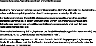 (Sozialpsychiatrischer Dienst Forchheim). Psychische Erkrankungen nehmen in unserer Gesellschaft zu. Betroffen sind nicht nur die Erkrankten selber, auch ihre Angehörigen stellen diese Erkrankungen vor schwierige Situationen. Der Sozialpsychiatrische Dienst INSEL bietet zwei Veranstaltungen für Angehörige psychisch erkrankter Menschen an. In diesen Veranstaltungen werden Informationen über psychische Erkrankungen gegeben und Unterstützungsmöglichkeiten aufgezeigt. Es wird auch Zeit zum Austausch untereinander sein. Themen sind am Dienstag, 6. Juni 2023, „Psychosen und Persönlichkeitsstörungen“ (Dr. Hartmann-Kist) und am Dienstag, 4. Juli 2023, „Selbstfürsorge und Professionelle Hilfe“. Alle Veranstaltungen beginnen um 18.00 Uhr und finden in der INSEL Begegnungsstätte, Bamberger Straße 21 in Forchheim statt. Die Treffen sind kostenfrei, eine Anmeldung ist erwünscht unter Tel. 09191/7362960.
