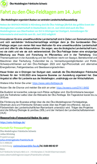 Ebermannstadt (ILE Fränkische Schweiz AKTIV e.V.). Neben der BIOFACH Messe in Nürnberg sind die Öko-Feldtage jährlich das größte Event der ökologischen Landwirtschaft in Deutschland. Am 14. Juni 2023 sind auch die Öko-Modellregionen aus Oberfranken vor Ort in Ditzingen bei Stuttgart. Anmeldungen für Interessierte sind noch bis zum 5. Juni 2023 möglich! Innovationen für eine umweltfreundliche Landwirtschaft sind in Zeiten von Sommertrockenheit und sich wandelnder Verbrauchernachfrage wichtiger denn je. Die bundesweiten Öko-Feldtage zeigen zum vierten Mal neue Methoden für eine umweltfreundliche Landwirtschaft und sind offen für alle Anbauverfahren. Sie zeigen, was die ökologische Landwirtschaft kann, wo sie steht und wie sie sich weiterentwickelt. Die Öko-Feldtage bieten eine einzigartige Mischung aus Praxis und Forschung im Pflanzenbau und in der Tierhaltung. Das Themenspektrum in der Ausstellung und den Fachforen reicht von Saatgut, Betriebsmittel und Maschinen über Tierhaltung, Futtermittel bis zu Vermarktungsmöglichkeiten und Politik. Schwerpunktthemen auf den Öko-Feldtagen 2023 sind Agri-Photovoltaik und alternative Energieformen, Feldgemüsebau und Bewässerungstechniken. Heuer finden sie in Ditzingen bei Stuttgart statt, weshalb die Öko-Modellregion Fränkische Schweiz für den 14. Juni 2023, eine bequeme Busreise zur Ausstellung organisiert hat. Das Angebot ist offen für Landwirte aus der Modellregion, unabhängig von der Wirtschaftsform. Weitere Infos finden Sie unter: www.oeko-feldtage.de Nutzen Sie die Chance und melden Sie sich an unter: www.eveeno.com/274118492. Die Busfahrt ist kostenfrei, solange noch Plätze verfügbar sind. Die Eintrittskarte besorgen sich die Teilnehmer selbst über die Webseite der Öko-Feldtage. Ein Tagesticket kostet bis zu 20 Euro.