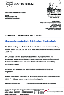 (Stadt Forchheim). Die Städtische Sing- und Musikschule Forchheim lädt zu ihrem Sommerkonzert ein, das am Freitag, 23. Juni 2023, um 19.00 Uhr in der Turnhalle der Martin-Grundschule stattfindet. Die Lehrkräfte haben in Zusammenarbeit mit ihren Musikschüler*innen ein kurzweiliges, abwechslungsreiches und auf hohem Niveau stehendes Programm mit Solist*innen und Ensembles vorbereitet. Das Publikum kann sich auf vielfältige Darbietungen freuen. Der Eintritt zum Konzert ist frei. Alle musikalisch Interessierten sind herzlich eingeladen! Nähere Informationen erhalten Sie im Musikschulsekretariat unter der Telefonnummer 09191/714 269 oder unter www.forchheim.de/musikschule.