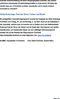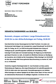 (Stadt Forchheim). Am ersten Juli-Wochenende finden nicht nur die Afrika Kulturtage in Forchheim statt, am Freitag, 30. Juni hat man bis 22.00 Uhr bei der „Langen Einkaufsnacht“ die Möglichkeit zu einer ausgiebigen Shoppingtour. Für diesen Abend hatte die große Kreisstadt einen Antrag auf Verlängerung der Ladenöffnungszeiten anlässlich der Veranstaltung "Afrika Kulturtage" für alle Läden der Innenstadt beantragt. Die Regierung von Oberfranken gab diesem Ersuchen statt. „Es besteht ein öffentliches Interesse zur Bewilligung der Ausnahme, da im Hinblick auf die Veranstaltung „Afrika Kulturtage“ am 30. Juni ein über das normale Maß hinaus-gehender Besucherandrang zu erwarten ist“, heißt es u.a. im Bescheid. Hocherfreut reagierte Oberbürgermeister Dr. Uwe Kirschstein auf diese positive Rückmeldung der Regierung: „Eine lange Einkaufsnacht mit Ladenöffnungszeiten bis 22.00 Uhr bietet neben dem spannenden Veranstaltungsprogramm der beliebten Afrika Kulturtage ein weiteres Highlight für die Gäste unserer Stadt. Ich freue mich auf ein erlebnisreiches Wochenende mit vielfältigen Angeboten. So können wir eine kulturelle Großveranstaltung mit einem Shoppingangebot verbinden, das unseren zahlreichen interessanten Einzelhandelsgeschäften zugutekommt. Wir laden alle herzlich dazu ein, in Forchheim zu feiern, einzukaufen und in unserer schönen Innenstadt zu verweilen!“