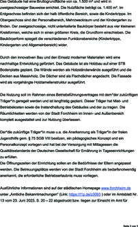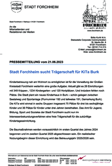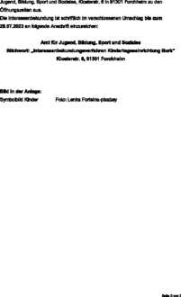 (Stadt Forchheim). Kinderbetreuung nah am Wohnort zu ermöglichen, ist für die Verwaltung der Großen Kreisstadt Forchheim weiterhin eine große Aufgabe: Aktuell gibt es 26 Einrichtungen mit 349 Krippen-, 1234 Kindergarten- und 120 Hortplätzen. Und trotzdem fehlen noch Plätze. Die Stadt plant ein neues Kinderhaus in Burk - schön gelegen zwischen Seetalweg und Sportanlage (Flurnummer 192 und teilweise 191, Gemarkung Burk). Die KiTa wird einmal in sechs Gruppen insgesamt 75 Plätze für drei bis sechsjährige Kinder und 36 Plätze für Kinder unter drei Jahren bereithalten. Das Amt für Jugend, Bildung, Sport und Soziales der Stadt Forchheim sucht nun im Interessenbekundungsverfahren eine freie Trägerschaft für die zukünftige Kindertageseinrichtung. Die Baumaßnahmen werden voraussichtlich im ersten Quartal des Jahres 2024 begonnen und im zweiten Quartal 2025 abgeschlossen sein. Ein realistischer Nutzungsbeginn dieser Einrichtung wird das Betreuungsjahr 2025/2026 sein. Das Gebäude hat eine Bruttogrundfläche von ca. 1.500 m² und wird in zweigeschossiger Bauweise errichtet. Die Nutzfläche beträgt ca. 1.400 m². Im Erdgeschoss befinden sich der halb öffentliche Bereich, sowie die Kinderkrippe. Im Obergeschoss sind der Personalbereich, Mehrzweckraum und der Kindergarten zu finden. Der zweigeschossige, nicht unterkellerte Baukörper besteht aus vier kleineren Kreisformen, welche sich in einen größeren Kreis, die Grundform einschieben. Die Baukörperform spiegelt die verschiedenen Funktionsbereiche (Kinderkrippe, Kindergarten und Allgemeinbereich) wider. Durch den innovativen Bau und den Einsatz moderner Materialien wird eine nachhaltige Entwicklung gefördert. Das Gebäude ist als Holzbau auf einer STB Bodenplatte geplant. Die Wände werden als Holzständerwände ausgeführt und die Decken aus Massivholz. Die Dächer sind als Flachdächer angedacht. Die Fassade wird als vorgehängte Holzlamellenstruktur ausgeführt. Die Nutzung soll im Rahmen eines Betriebsführungsvertrages mit dem*der zukünftigen Träger*in geregelt werden und ist langfristig geplant. Dieser Träger hat Miet- und Betriebskosten sowie die Instandhaltung des Gebäudes und der zu tragen. Die Räumlichkeiten werden von der Stadt Forchheim im Innen- und Außenbereich komplett ausgestattet und zur Nutzung überlassen. Der*die zukünftige Träger*in muss u.a. die Anerkennung als Träger*in der freien Jugendhilfe gem. § 75 SGB VIII besitzen, ein pädagogisches Konzept und ein Personalkonzept vorlegen und hat bei der Versorgung mit Mittagessen die Qualitätsstandards der Deutschen Gesellschaft für Ernährung in Tageseinrichtungen zu erfüllen. Die Öffnungszeiten der Einrichtung sollen an die Bedürfnisse der Eltern angepasst werden. Die Betreuungsplätze werden von der Stadt Forchheim als bedarfsnotwendig anerkannt, die erforderliche Betriebserlaubnis muss vorliegen. Ausführliche Informationen sind auf der städtischen Homepage www.forchheim.de unter „Amtliche Bekanntmachungen“ oder im Amtsblatt Nr. 13 vom 23. Juni 2023, S. 20 - 22 abgedruckt bzw. liegen zur Einsicht im Amt für Jugend, Bildung, Sport und Soziales, Klosterstr. 6 in 91301 Forchheim zu den Öffnungszeiten aus. Die Interessenbekundung ist schriftlich im verschlossenen Umschlag bis zum 28.Juli 2023 an folgende Anschrift einzureichen: