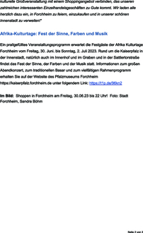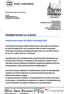 (Stadt Forchheim). Das Straßenverkehrsamt der Stadt Forchheim teilt mit, dass wegen der Ausrichtung der Afrika Kulturtage 2023 in der Innenstadt der Stadt Forchheim verschiedene Umleitungen, Parkverbote und Straßensperrungen seit dem 29. Juni 2023, 8.00 Uhr bis zum 2. Juli 2023, 24.00 Uhr in Kraft treten. Veranstaltungsort sind die Sattlertorstraße ab der Einmündung Schulstraße bis zur Einmündung ins Krottental, die Wallstraße ab dem Eingang zum Erlebnismuseum Rote Mauer sowie das Gelände der Kaiserpfalz: Die genannten Bereiche sind für den Fahrzeugverkehr im oben genannten Zeitraum komplett gesperrt. Der Verkehr zwischen Wallstraße und Sattlertorstraße wird über die Karolingerstraße umgeleitet. Die Zufahrt Krottental ist aus Fahrtrichtung Merowingerstraße bzw. Sattlertorstraße weiterhin möglich! Im gesperrten Bereich der Sattlertor- und Kapellenstraße ist das Parken nicht erlaubt. Es wird gebeten, die Beschilderung entsprechend zu beachten. Parkmöglichkeiten gibt es auf der Sportinsel, dem Seltsam II-Gelände und in der Ruhalmstraße.