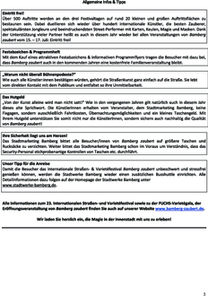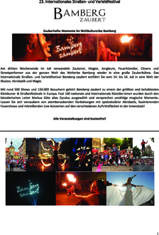 (Stadtmarketing Bamberg). Wenn in Hogwarts Sommerferien sind, treffen sich Bamberger, Touristen und Künstler aus der ganzen Welt, um ein wahrhaft magisches Wochenende zu feiern: Bamberg zaubert! Mit rund 500 Shows und 150.000 Besuchern gehört Bamberg zaubert zu einem der größten und beliebtesten Kleinkunst- und Straßenfestivals in Europa. Fast 100 nationale und internationale Künstler:innen wurden durch den künstlerischen Leiter Markus Götz alias Zyculus ausgewählt und versprechen unzählige magische Momente. Magier und Jongleure, Clowns und Akrobaten, Stelzenläufer und Pantomime, Feuertänzer und Komiker, Straßenkünstler und Musiker unterhalten das Publikium von Mittag bis Mitternacht und erschaffen eine Welt voll faszinierender Überraschungen. Dank der Unterstützung vieler Partner, heißt es auch in diesem Jahr wieder bei allen Veranstaltungen von Bamberg zaubert: Eintritt frei! Mit dem Kauf eines attraktiven Festabzeichens und des informativen Programmhefts (erhältlich vor Ort) tragen die Besucher dazu bei, dass Bamberg zaubert auch in den kommenden Jahren eine kostenfreie Familienveranstaltung bleibt. Mit Ihrem Hutgeld unterstützen Sie somit nicht nur die KünstlerInnen, sondern sichern auch nachhaltig die Qualität von Bamberg zaubert! Die Programmhighlights sowie alle wichtigen Informationen finden Sie unter www.bamberg-zaubert.de.