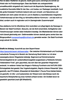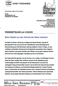 (Stadt Forchheim). Die Stadt Forchheim möchte den Umstieg aufs Fahrrad fördern, dies gilt für Berufspendler*innen wie auch für den Freizeitbereich. Einer Ertüchtigung der Radverbindung nach Kirchehrenbach steht grundsätzlich nichts im Wege, um eine unfallfreie, komfortable Verbindung für die Radelnden herzustellen: Eine möglichst ebene Fahrbahn, kein grober Schotter oder Pfützen und ein guter Unterbau könnten statt einer hier nicht angezeigten Asphaltierung schon viel bewirken. Die Frage stellt sich generell, wie sich der Neu- bzw. Ausbau von Radwegen mit dem Erhalt der Natur verträgt? Wie verhält es sich gar mit der Asphaltierung der Verkehrswege fürs Rad? Was passiert mit den Naturräumen, die durch die versiegelten Wege durchschnitten werden? Aus der Sicht des Naturschutzes entsteht hier durchaus ein Dilemma, wie Forchheims Bürgermeisterin Dr. Annette Prechtel betont: „Insbesondere die Asphaltierung kann sich in mehrerlei Hinsicht auf betroffene Lebensgemeinschaften sehr störend auswirken. Führen Radwege durch geschützte Gebiete, wie der jüngst diskutierte Radweg von Kirchehrenbach nach Forchheim, sollte der Aspekt des Schutzes von sensiblen Naturräumen nicht an letzter Stelle stehen!“ Der aktuell in der Diskussion stehende zwischen Kirchehrenbach und Forchheim verlaufende Flurweg ist im Bereich der Gemarkung Reuth bisher mit einer wassergebundenen Wegedecke befestigt. Beginnend auf Kirchehrenbacher Gemeindegebiet ist ein Landschaftsschutzgebiet ausgewiesen („Fränkische Schweiz-Veldensteiner Forst“, in beiliegender Grafik grün gepunktet), das sich über den gesamten Wegeverlauf erstreckt. Im weiteren Verlauf des Weges in Richtung Forchheim sind NATURA 2000-Schutzgebiete fest-gesetzt: Das Vogelschutzgebiet „Regnitz-Unteres Wiesenttal“ (blau gestreift), das FFH-Gebiet „Wiesenttal mit Seitentälern“ (Fauna-Flora-Habitat-Gebiet, rot gestreift). Im Ufer- und Auebereichen der Wiesent sind viele Biotope durch die bayerische Biotopkartierung (rosa markiert) erfasst worden. Ein Großteil davon ist gesetzlich geschützt (nach §30 BNatSchG). Nun steht hier die Forderung nach einer Asphaltierung der Wegeverbindung im Raum: Insgesamt sollte bei den Erwägungen zur Verbesserung der Radwegeverbindung bedacht werden, dass die hier ausgewiesen Schutzgebiete die besonders hohe Wertigkeit dieses Bereiches für Tiere und ihre Lebensräume unterstreichen. Der Erhalt dieser Schutzgüter dient auch dem Menschen als Rückzugsort und Naherholungsraum. Dies hat Oberbürgermeister Dr. Uwe Kirschstein schon 2022 auf eine entsprechende Anfrage von Bürgermeisterin Anja Gebhardt, Kirchehrenbach, mitgeteilt. Auf die naturschutzrechtliche Problematik, die die Fachämter bei der einer Asphaltierung von Wegen im FFH-Gebiet sehen, wurde dabei ausdrücklich hingewiesen und das Gespräch damit als abschließend betrachtet. Neben dem Aspekt der zunehmenden Flächenversiegelung ist vor allem die trennende Wirkung des Radweges für Tierpopulationen zu bedenken, erklärt das Sachgebiet Umwelt- und Naturschutz des Stadtplanungsamtes Forchheim: Asphaltierte Wirtschaftswege schaden der Natur mehr als Schotterwege oder Kies-Lehm-Wege. Vor allem sind auch die Wurzeln von angrenzenden Gehölzbeständen stärker durch Asphaltierung beeinträchtigt. Der Druck zur Asphaltierung von Radwegen aber nimmt zu, wobei meist auf bereits bestehende, asphaltierte Radwege verwiesen wird, stellt auch die Regierung von Oberfranken fest. Klar ist dabei: Radfahren ist gesund, macht gute Laune und bringt uns schnell zur Arbeit oder ins Freizeitvergnügen. Dass das Radeln als uneingeschränkt umweltfreundlich eingestuft wird, betont auch die Bayerische Staatsregierung, die zusätzliche finanzielle Mittel für den Neu- und Ausbau von Radwegen bereitstellt. Auch die große Kreisstadt Forchheim bekennt sich zum Umwelt- und Naturschutz und befindet sich nicht zuletzt mit dem im Juni im Stadtrat zu beschließenden Integrierten Verkehrskonzept auf dem Weg zur fahrradfreundlichen Kommune - und das nicht nur lokal, sondern auch im regionalen und im überregionalen Zusammenspiel! Das städtische Amt für öffentliches Grün kontrolliert und pflegt täglich die Radwege im Bereich der Stadt Forchheim. Bewuchs, der die Sicht einschränkt, Schlaglöcher oder Verschmutzungen werden dabei fortlaufend beseitigt. Die Mitarbeitenden können aber nicht überall gleichzeitig sein. Gefahrenstellen können deshalb gerne zentral über das Bürgerpostfach buergeranfrage@forchheim.de gemeldet werden. Die Stadt Forchheim sorgt zeitnah für Abhilfe.