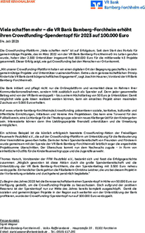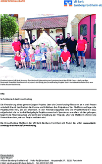 Forchheim (VR Bank Bamberg-Forchheim eG). Die Crowdfunding-Plattform „Viele schaffen mehr“ ist auf Erfolgskurs. Seit dem Start des Portals für gemeinnützige Projekte, das im März 2022 von der VR Bank Bamberg-Forchheim eG ins Leben gerufen wurde, haben über 2.300 Unterstützer insgesamt fast 300.000 Euro für die mittlerweile 43 Projekte gesammelt. Dieser Erfolg zeigt, wie gut Crowdfunding bei den Menschen vor Ort ankommt. „Mit unserer Crowdfunding-Plattform haben wir einen digitalen Ort der Begegnung geschaffen, in dem gemeinnützige Projekte und Unterstützer zueinanderfinden. Getreu dem genossenschaftlichen Prinzip fördert die VR Bank damit bürgerschaftliches Engagement“, sagt Joachim Hausner, Vorstand der VR Bank Bamberg-Forchheim eG. Die Bank initiiert und pflegt nicht nur die Onlineplattform und vermarktet diese im Rahmen ihrer Kommunikationsmaßnahmen, sondern tritt zusätzlich auch als Spender auf. Denn jeder gesammelte Betrag wird von der VR Bank verdoppelt - bis zu einem Höchstbetrag von 50 Euro je Unterstützer. Damit möglichst viele gute Ideen realisiert werden können, kann ein einzelnes Projekt einen maximalen Zuschuss von 5.000 Euro erhalten. Auf www.vrbank-bamberg-forchheim.de/crowdfunding präsentieren soziale, karitative, kulturelle und öffentliche Einrichtungen, Initiativen und Vereine ihre Projektideen. Das kann eine Torwand für den Fußballverein, eine Lichtanlage für die Theatergruppe oder ein neues Klettergerüst für den Kindergarten sein. Interessierte können dann ihre Lieblingsprojekte finanziell unterstützen und die Umsetzung ermöglichen. Ein schönes Beispiel ist die kürzlich erfolgreich beendete Crowdfunding-Aktion der Freiwilligen Feuerwehr Pautzfeld e.V., die auf der Crowdfunding-Plattform um Unterstützung für die Restaurierung ihrer Vereinsfahne geworben hatte. Dank der hohen Spendenbereitschaft von Freunden und Förderern wurde gemeinsam mit der Spende der VR Bank Bamberg-Forchheim eG letztlich sogar die angestrebte Projektsumme überschritten. Der Überschuss kommt nun dem Nachwuchs zugute - in Form von einheitlichen Outfits für die Kinderfeuerwehrgruppe und die Jugendfeuerwehr. Thomas Harsch, Vorsitzender der FFW Pautzfeld e.V., bedankt sich und fasst die Erfolgsgeschichte zusammen: „Möglich geworden ist diese Aktion durch die große Spendenbereitschaft und die Unterstützung der VR Bank Bamberg-Forchheim, die den Spendenbetrag mit 3.500 Euro nahezu verdoppelte. Ein herzlicher Dank geht an die Filialleiterin Christina Leistner, die uns bei diesem Projekt in der Vorbereitung anleitete und durchgehend persönlich begleitete.“ Zu Beginn des Jahres 2023 hat die Genossenschaftsbank einen Spendentopf in Höhe von 50.000 Euro zur Verfügung gestellt, um die Crowdfunding-Projekte zu bezuschussen. Doch aufgrund der positiven Resonanz ist der Spendentopf nun zur Mitte des Jahres bereits komplett ausgeschöpft. Damit die sozialen und gemeinnützigen Projekte in der Region auch weiterhin von der Unterstützung der Bank profitieren, wurde der Crowdfunding-Spendentopf nun auf 100.000 Euro verdoppelt.