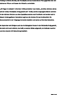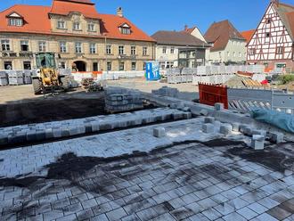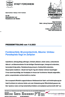 (Stadt Forchheim). Asphaltieren, Gehweg-Belag aufbringen, Fahrbahn pflastern, Stufen setzen, vorbereitende Abbruch- und Betonierarbeiten für die künftigen Überdachungen, Untergrund vorbereiten, Sonnendeck fertigstellen, Platzbeleuchtung erneuern, Fontänenfeld vorbereiten, Wasserspiele installieren: Aktuell sind Tag für Tag zehn Arbeiter mehrerer beauftragter Firmen damit beschäftigt, den Paradeplatz im Herzen der Forchheimer Altstadt zeitgemäßer, grüner, ansprechender und barrierefrei zu machen. Den europaweit öffentlich ausgeschriebenen Wettbewerb der Stadt- und Verkehrsplanung der Stadt Forchheim (in mehreren Stufen und unter Einbeziehung der Öffentlichkeit) gewann das Büro "grabner, huber und lipp landschaftsarchitekten und stadtplaner partnerschaft mbh" aus Freising: Es lieferte die Idee, den Paradeplatz als baumbestandenen Platz gegenüber den rein steinernen Plätzen und Gassen der Altstadt zu entwickeln. „Wir liegen im Zeitplan“, informiert Tiefbauamtsleiter Uwe Kredel, „bis Mitte nächsten Jahres soll der Umbau Paradeplatz fertiggestellt sein“. Große, bereits vorgezogene Bäume kommen in den nächsten Wochen aus einer Spezialbaumschule nach Forchheim und werden noch in diesem Herbst gepflanzt. Demnächst beginnen die Arbeiten für das Fontänenfeld. Die Brunnentechnik in der Tiefgarage ist bereits installiert und wartet auf die Inbetriebnahme. Im September wird übrigens auch das Archäologische Fenster in der Wallstraße fertiggestellt, bis dahin wird noch möbliert, das heißt, es werden Bänke aufgestellt, ein Geländer montiert und eine dezente LED-Beleuchtung installiert.