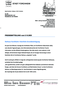 (Stadt Forchheim). Ein paar Euro-Münzen, Auszüge der Architektur-Pläne, ein Forchheimer Geburtstaler 2023, zwei aktuelle Tageszeitungen, eine Informationsbroschüre der Forchheimer Tourist-Information und die offizielle Einladungskarte: Dies alles steckt, unter anderem, in der silbrigen, 60 Zentimeter langen Edelstahl-Kapsel, die am 5. Oktober in einem feierlichen Akt im Forchheimer Rathaus „vergraben“ wurde. Damit wurde ganz offiziell, im Zuge der umfangreichen Sanierung des Forchheimer Rathauses, symbolisch der Grundstein gelegt. „Kein gewöhnliches, sondern ein ganz außergewöhnliches Gebäude und Denkmal nationalen Ranges, weit über die Grenzen Forchheims und Oberfrankens hinaus“, sei das Forchheimer Rathaus, so Oberbürgermeister Dr. Uwe Kirschstein in seiner Begrüßungsrede, die Ursprünge des Hauses datieren bis ins Jahr 1402 zurück. Zu dem Festakt in den Forchheimer Rathaushallen waren Gäste aus ganz Deutschland geladen, unter anderem Vertreter*innen der Regierung von Oberfranken und der Oberfranken- Stiftung, ein Vertreter der Bundesregierung für Kultur und Medien, Landrat, Landtagsabgeordnete, Staatsminister, Projektsteuerer, Architekten, Stadträtinnen und Stadträte, Mitarbeitende der Stadtverwaltung, GWS und Stadtwerke sowie auch Nachbarn des Forchheimer Rathauses. Bereits eine Woche zuvor wurde im kleinen Kreis, zusammen mit Archäologen, Restauratoren, Fachplanern, Handwerkern, Bauhofmitarbeitern, Bauherren und Zimmerern Richtfest am Forchheimer Rathaus gefeiert. Alle, die hinter die Kulissen der Rathaus-Baustelle blicken möchten, laden wir gerne zum Drohnenflug ein: Das Einchecken ist unter www.forchheim.de/rathaussanierung möglich.