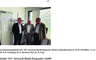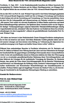 Forchheim (VOC-Advanced Breath Diagnostics GmbH). In der Krankenhausstraße besuchten der frühere bayerische Ministerpräsident Dr. Günther Beckstein und der frühere Oberbürgermeister von Erlangen Prof. Dr. Siegfried Balleis das neu errichtete Labor der VOC-Advanced Breath Diagnostics GmbH. Die im Jahr 2022 von Prof. Dr. med. Wieland Voigt und Dr. Karl-Heinz Schmiegelt gegründete VOC-Advanced Breath Diagnostics GmbH mit Sitz in Erlangen (Verwaltung) und Forchheim (Labor) befasst sich mit der Entwicklung und Vermarktung von Tests des menschlichen Atems mit dem Ziel die Lebensqualität und Lebenserwartung von Patienten weltweit zu verbessern: „Mit unseren Tests wollen wir relevante Krankheiten in frühen Stadien nachweisen und damit deren Behandlungserfolge optimieren. Das Spektrum dieser Atemtests reicht von der Diagnostik häufiger Verdauungsstörungen aufgrund bakterieller Dünndarmfehlbesiedlungen (häufig vergesellschaftet mit dem „Reizdarm“) über den Nachweis von Oxidativem Stress bis zu Krebserkrankungen wie dem Lungenkrebs“, erläutert der geschäftsführende Gesellschafter Prof. Dr. med. Wieland Voigt. „Wir haben uns bewusst in dem Medizintechnik Cluster Erlangen/Forchheim niedergelassen, da wir hier ein kreatives und unsere Aktivitäten förderndes Umfeld gefunden haben und wir mit unseren Lösungen und Innovationen einen Beitrag zur Verbesserung der allgemeinen Gesundheitsversorgung in der Region und darüber hinaus leisten wollen“ erklärt er. Während ihres mehrstündigen Besuches in Forchheim informierten sich Dr. Beckstein und Prof. Dr. Balleis im Rahmen einer Führung durch das Labor und einer Präsentation der Strategie der Gesellschaft über die gegenwärtigen und künftigen Schwerpunkte dieser wissenschaftlichen Arbeit. In der sich anschließenden intensiven Diskussion äußerten die Gäste ihre Überzeugung von der zu erwartenden gesundheitspolitischen Bedeutung dieser Entwicklungsarbeiten und dem Mehrwert der Lösungen für die medizinische Versorgung der Menschen. Dr. Beckstein betonte, dass gerade der Fokus dieser Entwicklungsprojekte für die Bereiche Früherkennung und Prävention von Erkrankungen die Hoffnung wecke, hierdurch Verbesserungen bei den aktuellen medizinischen und ökonomischen Herausforderungen des Gesundheitssystems zu schaffen. Professor Balleis sagte als langjähriger Promoter des Medical Valley zu, die Entwicklung der Gesellschaft in der Europäischen Metropolregion Nürnberg zu unterstützen.