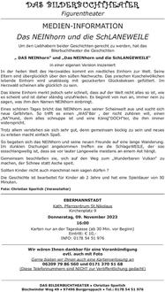 Ebermannstadt (DAS BILDERBUCHTHEATER). Am Donnerstag, 9., November 2023 treffen um 16.00 Uhr im Kath. Pfarrzentrum St.Nikolaus, Kirchenplatz 9 in Ebermannstadt das NEINhorn und die SchLANEWEILE aufeinander. In der heilen Welt des Herzwaldes kommt ein niedliches Einhorn zur Welt. Seine Eltern sind überglücklich über den süßen Nachwuchs. Das zwischen Kuschelwölkchen lebende Einhorn wird unablässig mit gezuckerten Glückskeksen gefüttert. Im Herzwald scheinen alle glücklich zu sein. Das kleine Einhorn merkt jedoch sehr schnell, dass auf der Welt nicht alles so ist, wie es scheint und ist daher ständig unzufrieden. Es beginnt von nun an, immer nein zu sagen, was ihm den Namen NEINhorn einbringt. Eines schönen Tages bricht das NEINhorn aus seiner Scheinwelt aus und sucht sich neue Gefährten. So trifft es einen „WAS“Bär, der nicht zuhören will, einen „NA“Hund, dem alles schnuppe ist und eine König“DOCH“ter, die ihm immer widerspricht. Trotz allem verstehen sie sich sehr gut, denn gemeinsam bockig zu sein und neues zu erleben macht einfach Spaß. So begeben sich das NEINhorn und seine neuen Freunde auf eine lange Wanderung. Im dunklen Dschungel angekommen treffen sie die SchlageWEILE, der soo sssschlangweilig ist, dass sie vor lauter Langeweile meistens an einem Ast hängt. Gemeinsam beschließen sie, sich auf den Weg zum „Wunderbaren Vulkan“ zu machen, der Schnee statt Asche speit. Um den Liebhabern beider Geschichten gerecht zu werden, hat das Bilderbuchtheater die Geschichten „ DAS NEINhorn“ und „Das NEINhorn und die SchLANGEWEILE“ in einer eigenen Version inszeniert. Die Geschichte ist bearbeitet für Kinder ab 2 Jahre und hat eine Spieldauer von 50 Minuten. Karten gibt es nur an der Tageskasse (ab 30 Min. vor Beginn). Der Eintritt kostet 10 Euro. Infos: Tel. 0178/54 51 976.