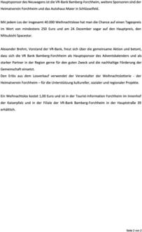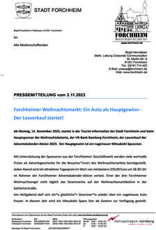 (Stadt Forchheim). Vor ein paar Tagen ist in der Tourist-Information der Stadt Forchheim und beim Hauptsponsor der Weihnachtslotterie, der VR-Bank Bamberg-Forchheim, der Losverkauf der Adventskalender-Aktion 2023 gestartet. Der Hauptgewinn ist ein nagelneuer Mitsubishi Spacestar. Mit Unterstützung der Sponsoren aus der Forchheimer Geschäftswelt werden viele wertvolle Preise als Adventsgeschenke für die Besucher*innen des Weihnachtsmarktes bereitgestellt. Jeden Abend wird ein attraktiver Tagespreis im Wert von mindestens 250,00 Euro um 18.30 Uhr im Rahmen der Forchheimer Adventskalender-Aktion verlost. Einer der drei Forchheimer Weihnachtsengel zieht täglich das Gewinnerlos auf der Weihnachtsmarktbühne in der Sattlertorstraße. Am Heiligabend darf sich ein*e glückliche*r Gewinner*in wieder über ein nagelneues Auto freuen. In diesem Jahr wird ein Mitsubishi Space Star als Gewinn zur Verfügung gestellt. Hauptsponsor des Neuwagens ist die VR-Bank Bamberg-Forchheim, weitere Sponsoren sind der Heimatverein Forchheim und das Autohaus Maier in Schlüsselfeld. Mit jedem Los der insgesamt 40.000 Weihnachtslose hat man die Chance auf einen Tagespreis im Wert von mindestens 250 Euro und am 24. Dezember sogar auf den Hauptpreis, den Mitsubishi Spacestar. Alexander Brehm, Vorstand der VR-Bank, freut sich über die gemeinsame Aktion und betont, dass sich die VR Bank Bamberg-Forchheim als Hauptsponsor des Adventskalenders und als starker Partner in der Region gerne für den guten Zweck und die nachhaltige Förderung der Gemeinschaft einsetzt. Den Erlös aus dem Losverkauf verwendet der Veranstalter der Weihnachtslotterie - der Heimatverein Forchheim - für die Unterstützung kultureller, sozialer und regionaler Projekte. Ein Weihnachtslos kostet 1,00 Euro und ist in der Tourist-Information Forchheim im Innenhof der Kaiserpfalz und in der Filiale der VR-Bank Bamberg-Forchheim in der Hauptstraße 39 erhältlich.