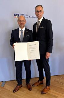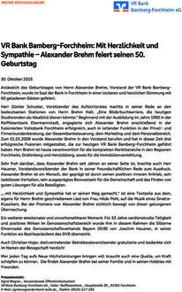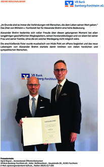 (VR Bank Bamberg-Forchheim). Anlässlich des Geburtstages von Herrn Alexander Brehm, Vorstand der VR Bank Bamberg- Forchheim, wurde im Saal der Bank in Forchheim in einer lockeren und herzlichen Stimmung mit 60 geladenen Gästen gefeiert. Herr Günter Schuster, Vorsitzender des Aufsichtsrates machte in seiner Rede an den bedeutsamen Stationen von Herrn Brehm Halt. „Eine Bilderbuchkarriere, die heutigen Studierenden als Idealbild dienen könnte.“ Beginnend mit der Ausbildung im Jahre 1990 in der Raiffeisenbank Ebermannstadt, engagierte sich Alexander Brehm anschließend in der fusionierten Volksbank Forchheim erfolgreich, auch in leitender Funktion in der Privat- und Firmenkundenberatung, der Gesamtbanksteuerung, dem Marketing und dem Personalbereich. Zum 01.01.2009 wurde Alexander Brehm in den Vorstand berufen und hat in dieser Zeit drei erfolgreiche Fusionen mitgestaltet, die zur heutigen VR Bank Bamberg-Forchheim geführt haben. Herr Brehm ist heute verantwortlich für die kompletten Marktbereiche in den Regionen Forchheim, Gräfenberg und Heroldsberg, sowie für die Immobilienvermittlung. Sehr froh darüber, dass Alexander Brehm seit Jahren an seiner Seite ist, brachte auch Herr Hausner, Vorstandsvorsitzender der Bank in seiner freundschaftlichen Rede zum Ausdruck. Alexander Brehm ist ein Mensch, der geprägt ist durch seinen positiven inneren Antrieb, sein tadelloses Verhalten, sein ausgeprägtes Bewusstsein für die Gemeinschaft und das Finden von guten Lösungen für alle Beteiligten. „…mit Herzlichkeit und Sympathie hat er seinen Weg gemacht.“ ist eine Textzeile aus dem, eigens für Herrn Brehm geschriebenem Lied von Frau Hilde Pohl, auf die Musik eines Sinatra- Klassikers. Bei der Premiere war Alexander Brehm sichtlich bewegt von dieser gelungenen Überraschung. Ein weiterer emotionaler und unvorhersehbarer Moment: Für 33 Jahre verdienstvolle Tätigkeit und positives Wirken im Genossenschaftsbereich wurde ihm in diesem Rahmen die Silberne Ehrennadel des Genossenschaftsverbands Bayern (GVB) von Joachim Hausner, in seiner Funktion als Bezirkspräsident des GVB überreicht. Auch Christian Hojer, stellvertretender Betriebsratsvorsitzender gratulierte und bedankte sich im Namen der Belegschaft herzlich! Wer jeden Tag aufs Neue Höchstleistungen bringen will braucht auch eine Quelle, um Kraft schöpfen zu können. Die findet Alexander Brehm bei seiner Familie und in seinen Hobbies mit Freunden. Das Zitat von Wilhelm v. Humboldt hat für Alexander Brehm eine hohe Bedeutung. Alexander Brehm bedankte sich voller Freude über diesen gelungenen Moment bei allen langjährigen geschäftlichen Wegbegleitern, seinen Vorstandskollegen und vor allem bei seiner Frau und seiner Familie, ohne die ein solcher Werdegang nicht möglich wäre. Die anschließende Feier wurde musikalisch von Hilde Pohl am ePiano begleitet und das neue Lebensjahr von Alexander Brehm startete damit inmitten von vielen herzlichen und sympathischen Menschen.
