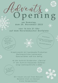 Heroldsbach. Bald schon ist der erste Advent, dann dauert es gar nicht mehr sooo lange bis Weihnachten und so allmählich steigt die weihnachtliche Stimmung in der Region. Die Gemeinde Heroldsbach lädt kleine und große Besucher am Samstag, 25. November 2023, in der Zeit von 14.00 bis 21.00 Uhr, ganz herzlich zum diesjährigen „Advents Opening“ ein. Auf dem Heroldsbacher Dorfplatz finden sich ein Kreativmarkt mit handgemachten Produkten, weihnachtliche Leckereien und Spezialitäten von süß bis deftig. Um 16 Uhr präsentiert sich der Kinderchor „Cäcilia“ auf der Bühne. Danach, um 17 Uhr, gibt sich Alexander Ezhelev die Ehre und singt weihnachtliche Lieder. Doch das war noch nicht alles. In der Zeit von 16 bis 18 Uhr können die Kleinen beim Kinderglücksrad ihr Glück versuchen. Ankes Schul- und Wolladen hat an diesem Samstag bis 18 Uhr geöffnet und auch das Atelier Schmidt öffnet seine Türen. Im Posthaus gibt es nicht nur Kaffee und Kuchen im „Strick-Café“, sondern auch die Möglichkeit das „Ruckskripperla“ zu besichtigen.