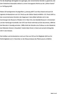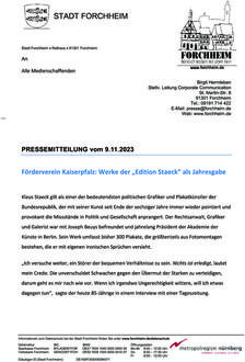 (Stadt Forchheim). Klaus Staeck gilt als einer der bedeutendsten politischen Grafiker und Plakatkünstler der Bundesrepublik, der mit seiner Kunst seit Ende der sechziger Jahre immer wieder pointiert und provokant die Missstände in Politik und Gesellschaft anprangert. Der Rechtsanwalt, Grafiker und Galerist war mit Joseph Beuys befreundet und jahrelang Präsident der Akademie der Künste in Berlin. Sein Werk umfasst bisher 300 Plakate, die größtenteils aus Fotomontagen bestehen, die er mit eigenen ironischen Sprüchen versieht. „Ich versuche weiter, ein Störer der bequemen Verhältnisse zu sein. Nichts ist erledigt, lautet mein Credo. Die unverschuldet Schwachen gegen den Übermut der Starken zu verteidigen, darum geht es mir nach wie vor. Wenn ich irgendwo Ungerechtigkeit wittere, will ich etwas dagegen tun“, sagte der heute 85-Jährige in einem Interview mit einer Tageszeitung. Für die diesjährige Jahresgabe ist es gelungen, den renommierten Künstler zu gewinnen, der dem Förderkreis Kaiserpfalz exklusiv zu einem Vorzugspreis Werke aus der „Edition Staeck“ zur Verfügung stellt. Neben 20 handsignierten Druckgrafiken („Leistung zählt“) von Klaus Staeck sind auch 20 signierte Armbanduhren von A.R. Penck aus der Edition Staeck erhältlich. A.R. Penck zählt zu den renommiertesten Künstlern der Gegenwart. Seine Bilder befinden sich in den Sammlungen des Museum of Modern Art in New York, des Stedelijk Museum in Amsterdam und der Hamburger Kunsthalle. Seit 1972 war Penck mehrmals auf der documenta, 1984 bei der Biennale in Venedig vertreten. 1988 erhielt der Künstler eine Professur an der Akademie der Bildenden Künste in Düsseldorf. Zuletzt lebte Penck in Irland und verstarb Anfang Mai 2017 in der Schweiz. Die Grafiken und Armbanduhren sind zum Preis von 50 Euro für Mitglieder (60 Euro für Nichtmitglieder) an der Museumskasse des Pfalzmuseums erhältlich.