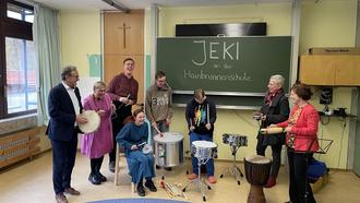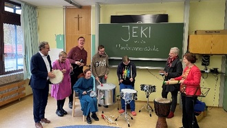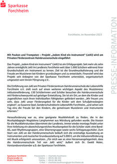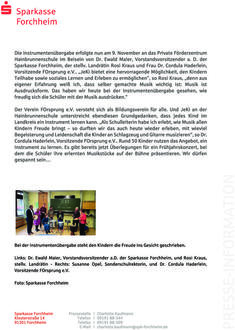 (Sparkasse Forchheim). Das Projekt „Jedem Kind ein Instrument“ (JeKi) ist ein Erfolgsprojekt. Seit mehr als zehn Jahren ermöglicht JeKi im Landkreis Forchheim weit über 1.000 Schülern während ihrer Grundschulzeit ein Instrument zu lernen. Ziel ist die Grundmusikalisierung und die Freude am Musizieren bei Kindern grundzulegen und zu entwickeln. Finanziell wird das Projekt seit Anbeginn von der Sparkasse Forchheim unterstützt, organisatorisch umgesetzt vom Verein FOrsprung e.V.. Die Einführung von JeKi am Privaten Förderzentrum Hainbrunnenschule der Lebenshilfe Forchheim e.V. zielt noch auf einen weiteren wichtigen Aspekt des Musizierens: Inklusionsförderung. 130 Schülerinnen und Schüler besuchen die Hainbrunnenschule mit Förderschwerpunkt auf geistiger Entwicklung. Sie ist ein Ort, an dem die Kinder und Jugendlichen nach ihren individuellen Fähigkeiten gefördert werden. „Wir freuen uns sehr, dass JeKi unser Förderangebot für die Kinder seit dem Schuljahresbeginn ergänzt“, so Susanne Opel, Sonderschulrektorin Lebenshilfe Forchheim, „und sehen seit Tag eins die Freude bei den Kindern, die gemeinsam Musizieren und Instrumente erlernen.“ Herausforderung war es, eine geeignete Musiklehrkraft zu finden, die in der Musikpädagogin Magdalena Langhammer aus Würzburg gefunden wurde. Die Kosten für die Musiklehrstunden übernimmt der Landkreis. Immer wieder montags findet unter ihrer Anleitung ein abwechslungsreiches Musikangebot für die Schüler statt: eine Band-AG, zwei Rhythmusgruppen, eine Gitarrengruppe sowie sechs Schlagzeugschüler. Zum Start von JeKi an der Hainbrunnenschule beläuft sich die erstmalige Ausstattung an Instrumenten und musischer Grundausstattung auf 5.000 €, um die Inklusionsförderung mit Musik erfolgreich umzusetzen. „Für mich war es eine Herzensangelegenheit, dass die Hainbrunnenschule Teil von JeKi wird,“ äußert sich Dr. Ewald Maier, Vorstandsvorsitzender a.D. der Sparkasse Forchheim. Die Instrumentenübergabe erfolgte nun am 9. November an das Private Förderzentrum Hainbrunnenschule im Beisein von Dr. Ewald Maier, Vorstandsvorsitzender a. D. der Sparkasse Forchheim, der stellv. Landrätin Rosi Kraus und Frau Dr. Cordula Haderlein, Vorsitzende FOrsprung e.V.. „JeKi bietet eine hervorragende Möglichkeit, den Kindern Teilhabe sowie soziales Lernen und Erleben zu ermöglichen“, so Rosi Kraus, „denn aus eigener Erfahrung weiß ich, dass selber gemachte Musik wichtig ist: Musik ist Ausdrucksform. Das haben wir heute bei der Instrumentenübergabe gesehen, wie freudig sich die Schüler mit der Musik ausdrücken.“ Der Verein FOrsprung e.V. versteht sich als Bildungsverein für alle. Und JeKi an der Hainbrunnenschule unterstreicht ebendiesen Grundgedanken, dass jedes Kind im Landkreis ein Instrument lernen kann. „Als Schulleiterin habe ich erlebt, wie Musik allen Kindern Freude bringt - so durften wir das auch heute wieder erleben, mit wieviel Begeisterung und Leidenschaft die Kinder an Schlagzeug und Gitarre musizieren“, so Dr. Cordula Haderlein, Vorsitzende FOrsprung e.V.. Rund 50 Kinder nutzen das Angebot, ein Instrument zu lernen. Es gibt bereits jetzt Überlegungen für ein Frühjahrskonzert, bei dem die Schüler ihre erlernten Musikstücke auf der Bühne präsentieren. Wir dürfen gespannt sein…