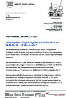 (Stadt Forchheim). Die Stadt Forchheim macht darauf aufmerksam, dass wegen einer geplanten „Drückjagd“ am Samstag, 2. Dezember 2023, zwischen 08.00 und 15.00 Uhr das Waldgebiet im Burker Wald zwischen dem Stadtteil Buckenhofen und dem Staatswaldgebiet komplett gesperrt ist. Auf Waldspaziergänge, Joggen, Radfahren, Gassigehen, Pilzesammeln etc. muss im genannten Bereich zur eigenen Sicherheit in diesem Zeitraum verzichtet werden, es besteht Gefahr für Leib und Leben! Entsprechende Kennzeichnungen und Absperrungen der Stadtförsterei sind dringend zu beachten! Die Beschränkung für Erholungssuchende soll so kurz wie möglich dauern, erklärt die Stadtförsterei, die Rechtsgrundlage für die Maßnahme ist der Art. 33 Abs. 3 des BayNatSchG. Bei Drückjagden wird versucht, das Wild bewusst langsam aus seinen Einständen (etwa aus Dickungen, Brombeerverhauen, Schilfgürteln etc.) heraus und in Bewegung zu bringen, um einen sicheren Schuss zu ermöglichen.