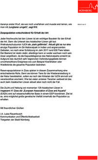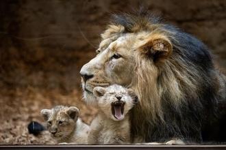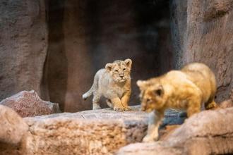 Die beiden Löwenwelpen kamen am 16. September 2023 zur Welt. Löwin Aarany hat sie von Beginn an gut angenommen und gesäugt. Um die Löwin nicht zu irritieren, hatten sich in den ersten Wochen auch die Tierpflegerinnen und Tierpfleger nicht genähert. Löwenkater Kiron blieb jedoch die gesamte Zeit bei ihr, die beiden wurden weder vor noch nach der Geburt getrennt. Kiron kam im August vergangenen Jahres auf Empfehlung des Europäischen Zuchtprogramms „EAZA Exsitu Programme“ (EEP) aus dem Zoo Frankfurt nach Nürnberg. Er und Aarany haben sich von Anfang an sehr gut verstanden. Im Mai dieses Jahres hatte Aarany bereits vier Löwenwelpen zur Welt gebracht, die allerdings nicht überlebt hatten. Drei davon hatte sie kurz nach der Geburt aufgefressen - ein Verhalten, das bei unerfahrenen Löwinnen allerdings nicht ungewöhnlich ist. „Es war Aaranys erster Wurf, sie war noch unerfahren und musste erst lernen, wie man mit Jungtieren umgeht“, sagt Will.