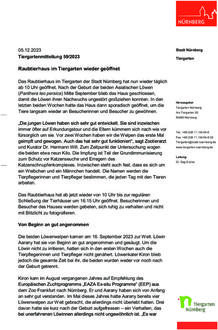(Tiergarten der Stadt Nürnberg). Das Raubtierhaus im Tiergarten der Stadt Nürnberg hat nun wieder täglich ab 10 Uhr geöffnet. Nach der Geburt der beiden Asiatischen Löwen (Panthera leo persica) Mitte September blieb das Haus geschlossen, damit die Löwen ihren Nachwuchs ungestört großziehen konnten. In den Herausgeber letzten beiden Wochen hatte das Haus dann sporadisch geöffnet, um die Tiere langsam wieder an Besucherinnen und Besucher zu gewöhnen. „Die jungen Löwen haben sich sehr gut entwickelt. Sie sind inzwischen immer öfter auf Erkundungstour und die Eltern kümmern sich nach wie vor fürsorglich um sie. Ende November haben wir die Welpen das erste Mal geimpft und gewogen. Auch das hat sehr gut funktioniert“, sagt Zootierarzt und Kurator Dr. Hermann Will. Zum Zeitpunkt der Untersuchung wogen die beiden etwa neun Kilo. Die Impfung ist Teil der Grundimmunisierung Leitung zum Schutz vor Katzenseuche und Erregern des Katzenschnupfenkomplexes. Inzwischen steht auch fest, dass es sich um ein Weibchen und ein Männchen handelt. Die Namen werden die Tierpflegerinnen und Tierpfleger bestimmen, die jeden Tag mit den Tieren arbeiten. Das Raubtierhaus hat ab jetzt wieder von 10 Uhr bis zur regulären Schließung der Tierhäuser um 16.15 Uhr geöffnet. Besucherinnen und Besucher des Hauses werden gebeten, sich ruhig zu verhalten und nicht mit Blitzlicht zu fotografieren.