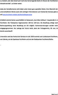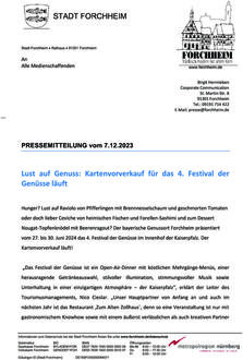 (Stadt Forchheim). Hunger? Lust auf Raviolo von Pfifferlingen mit Brennnesselschaum und geschmorten Tomaten oder doch lieber Ceviche von heimischen Fischen und Forellen-Sashimi und zum Dessert Nougat-Topfenknödel mit Beerenragout? Der bayerische Genussort Forchheim präsentiert vom 27. bis 30. Juni 2024 das 4. Festival der Genüsse im Innenhof der Kaiserpfalz. Der Kartenvorverkauf läuft! „Das Festival der Genüsse ist ein Open-Air-Dinner mit köstlichen Mehrgänge-Menüs, einer herausragende Getränkeauswahl, stilvoller Illumination, stimmungsvoller Musik sowie Unterhaltung in einer einzigartigen Atmosphäre - der Kaiserpfalz“, erklärt der Leiter des Tourismusmanagements, Nico Cieslar. „Unser Hauptpartner von Anfang an und auch im nächsten Jahr ist das Restaurant,Zum Alten Zollhaus`, denn so eine Veranstaltung ist nur mit gastronomischem Knowhow sowie mit einem äußerst verlässlichen als auch kreativen Partner zu meistern, der oben drauf auch noch eine hervorragende Küche im Herzen der Forchheimer Altstadt betreibt“, so Cieslar weiter. Jedes der Genießermenüs steht dabei unter einem ganz speziellen Motto. Eine Übersicht der unterschiedlichen Menüs sowie alle wichtigen Informationen zum Festival der Genüsse gibt es auf www.forchheim-erleben.de/festivaldergenuesse. Erhältlich sind die Karten ausschließlich im Restaurant „Zum Alten Zollhaus“, Hauptstraße 4, in Forchheim. Die Ticketpreise liegenzwischen 109 bis 129 Euro. Die Bezahlung erfolgt nach Rechnungsstellung; keine Bezahlung vor Ort möglich. Kartenreservierungen werden nicht entgegengenommen. Nur solange der Vorrat reicht, denn der Freitagstermin, 28. Juni, ist bereits ausverkauft! Unterstützt wird das Festival der Genüsse im Jahr 2024 erstmals vom Landratsamt Forchheim, von Valuniq, von der Sparkasse Forchheim und von den Stadtwerken Forchheim/foOne.