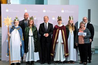 Berlin (Kindermissionswerk „Die Sternsinger“). Die Sternsinger Anna (13), Julia (14), Samuel (11) und Valentin (12) sowie Begleiterin Maria Hübner-Roppelt aus der Pfarrgemeinde St. Matthäus in Wiesenthau vertraten 2023 das Erzbistum Bamberg beim Sternsinger-Empfang von Bundeskanzler Olaf Scholz zur 65. Aktion Dreikönigssingen.