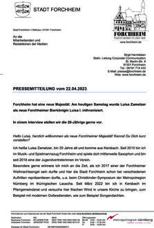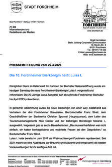(Stadt Forchheim). Königlicher Glanz im Kellerwald: Im Rahmen der Bierkeller Saisoneröffnung wurde im April 2023 die neue Forchheimer Bierkönigin Luisa I. vorgestellt und inthronisiert. Die 20-jährige Luisa Zametzer darf ab sofort die Forchheimer Bierkultur bis April 2025 präsentieren. Seit 2021 macht sie eine Ausbildung zur Brauerin und Mälzerin und bringt somit die besten Voraussetzungen für ihr künftiges Amt mit.