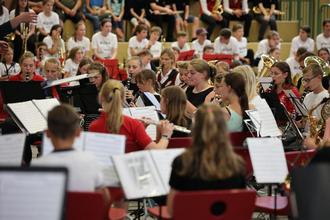 Forchheim (Musikverein Forchheim-Buckenhofen). Zu einer mehr als gelungenen Generalprobe für das große Jubiläumsfest wurde für den Musikverein Forchheim-Buckenhofen (MVFB) das "Jugend-Wertungsspiel-Event" im und am Forchheimer Ehrenbürggymnasium am 1. Juli 2023. Beste Voraussetzungen für den MVFB, zu seinem 50. Gründungsfest, vom Donnerstag, 13. Juli bis Sonntag, 16. Juli, das Kultursommerquartier der Stadt gleich vier Tage lang mit mundgeblasener Musik zu erfüllen. Bereits am Freitagabend wurde es festlich. Die Bläserphilharmonie Forchheim, das musikalische Flaggschiff des MVFB, umrahmte mit einem besonderen Musikprogrammm aus fünf Jahrzehnten einen unterhaltsamen Festabend vor geladenen Gästen, der zu einem kurzweiligen Kaleidoskop der vergangenen 50 Jahre wurde. Am Abend des Fest-Sonntags gingen die Festtage mit einem großen Gemeinschaftschor zu Ende, bei dem nahezu 200 Musikerinnen und Musiker zwischen 7 und 77 zusammen Musik machten. Ganz nach dem Motto "Gemeinsam statt einsam"!