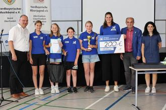 Die siegreichen Musiker* des MVFB-Juniororchesters, eingerahmt von Vorstand Bernd Froese (links), sowie Verbandspräsident Thomas Kolb und Bläserjugend-Koordinatorin Tanja Berthold.