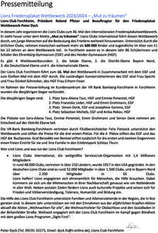 (VR Bank Bamberg-Forchheim eG). 2023 die Lions Clubs zum 36. Mal den internationalen Friedensplakatwettbewerb. Das Motto „Mut zu träumen“. Lions Clubs International führt diesen Wettbewerb durch, um junge Menschen auf die Bedeutung des Friedens weltweit hinzuweisen. Unterstützt durch die örtlichen Clubs, nehmen inzwischen weltweit mehr als 600 000 Kinder und Jugendliche im Alter von 11 bis 13 Jahren an dem Wettbewerb teil. In Forchheim waren es 2023 86 Schülerinnen und Schüler des Ehrenbürg-Gymnasiums (EGF) und des Herder-Gymnasiums (HGF). Im Rahmen einer Preisverleihung wurden die Sieger verkündet.