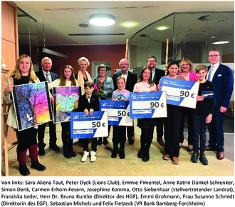 (V. li.): Sara-Aliena Taut, Peter Dyck (Lions Club), Emmie Pimentel, Anne Katrin Dünkel-Schrenker, Simon Denk, Carmen Erhorn-Fesern, Josephine Komma, Otto Siebenhaar (stellvertretender Landrat), Franziska Leder, Herr Dr. Bruno Kuntke (Direktor des HGF), Emmi Grohmann, Frau Susanne Schmidt (Direktorin des EGF), Sebastian Michels und Felix Fietzeck (VR Bank Bamberg-Forchheim).