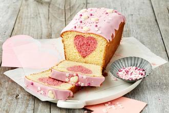 4. Vom rosa gefärbten Kuchen die beiden Endstücke dünn abschneiden. Den Kuchen in etwa 1, 5 cm dicke Scheiben schneiden. Die Scheiben auf das Brett legen und Herzen (etwa 5 cm) ausstechen.