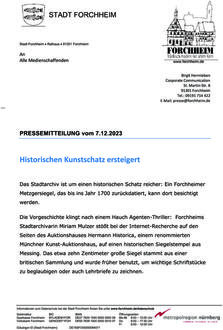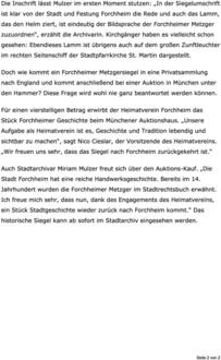(Stadt Neumarkt). Das Stadtarchiv ist um einen historischen Schatz reicher: Ein Forchheimer Metzgersiegel, das bis ins Jahr 1700 zurückdatiert, kann dort besichtigt werden. Die Vorgeschichte klingt nach einem Hauch Agenten-Thriller: Forchheims Stadtarchivarin Miriam Mulzer stößt bei der Internet-Recherche auf den Seiten des Auktionshauses Hermann Historica, einem renommierten Münchner Kunst-Auktionshaus, auf einen historischen Siegelstempel aus Messing. Das etwa zehn Zentimeter große Siegel stammt aus einer britischen Sammlung und wurde früher benutzt, um wichtige Schriftstücke zu beglaubigen oder auch Lehrbriefe zu zeichnen. Die Inschrift lässt Mulzer im ersten Moment stutzen: „In der Siegelumschrift ist klar von der Stadt und Festung Forchheim die Rede und auch das Lamm, das den Helm ziert, ist eindeutig der Bildsprache der Forchheimer Metzger zuzuordnen“, erzählt die Archivarin. Kirchgänger haben es vielleicht schon gesehen: Ebendieses Lamm ist übrigens auch auf dem großen Zunftleuchter im rechten Seitenschiff der Stadtpfarrkirche St. Martin dargestellt. Doch wie kommt ein Forchheimer Metzgersiegel in eine Privatsammlung nach England und kommt anschließend bei einer Auktion in München unter den Hammer? Diese Frage wird wohl nie ganz beantwortet werden können. Für einen vierstelligen Betrag erwirbt der Heimatverein Forchheim das Stück Forchheimer Geschichte beim Münchener Auktionshaus. „Unsere Aufgabe als Heimatverein ist es, Geschichte und Tradition lebendig und sichtbar zu machen“, sagt Nico Cieslar, der Vorsitzende des Heimatvereins. „Wir freuen uns sehr, dass das Siegel nach Forchheim zurückgekehrt ist.“ Auch Stadtarchivar Miriam Mulzer freut sich über den Auktions-Kauf. „Die Stadt Forchheim hat eine reiche Handwerksgeschichte. Bereits im 14. Jahrhundert wurden die Forchheimer Metzger im Stadtrechtsbuch erwähnt. Ich freue mich sehr, dass nun, dank des Engagements des Heimatvereins, ein Stück Stadtgeschichte wieder zurück nach Forchheim kommt.“ Das historische Siegel kann im Stadtarchiv eingesehen werden.